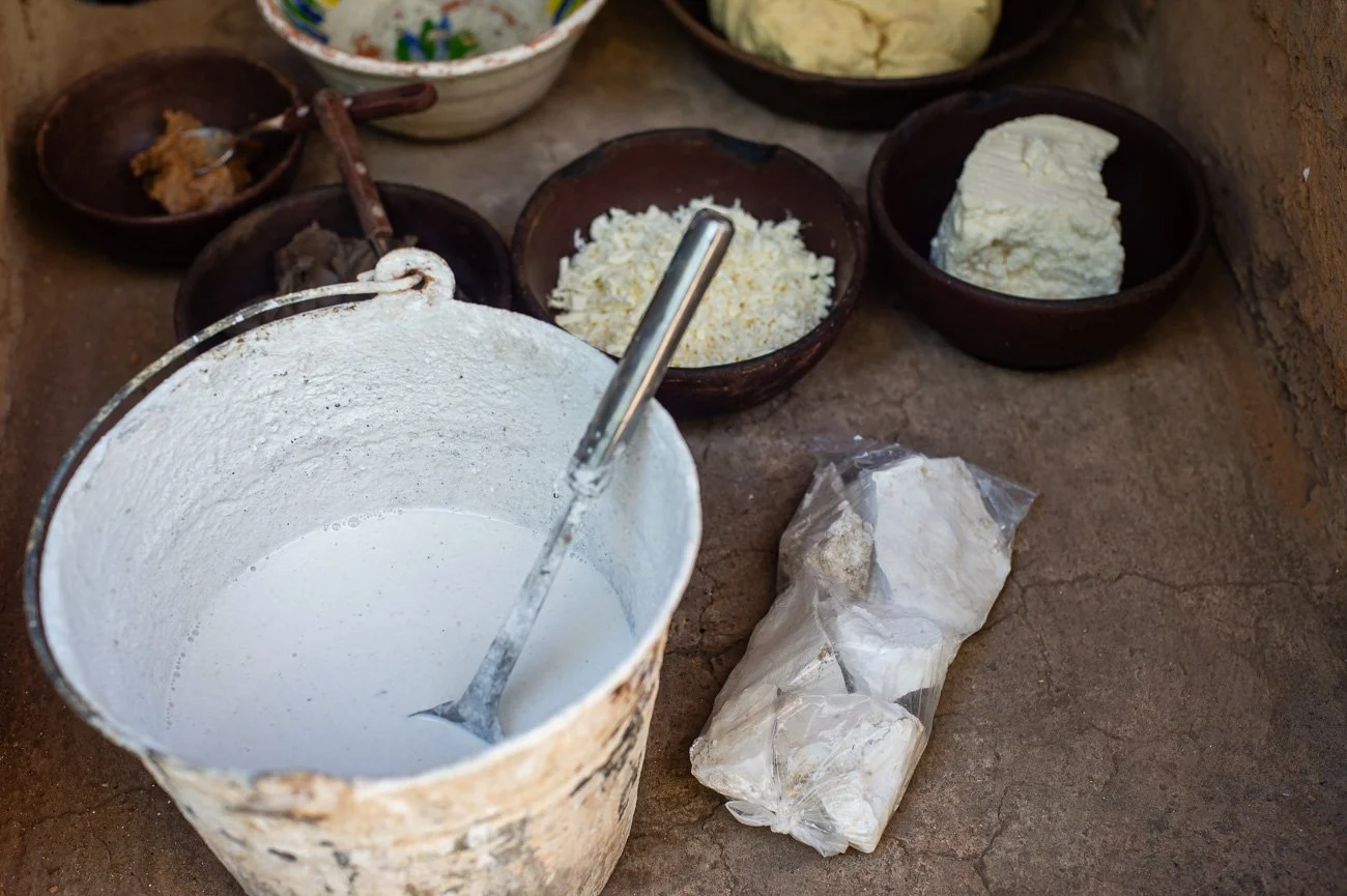 From left, lime solution, cal en piedra as sold at the markets.