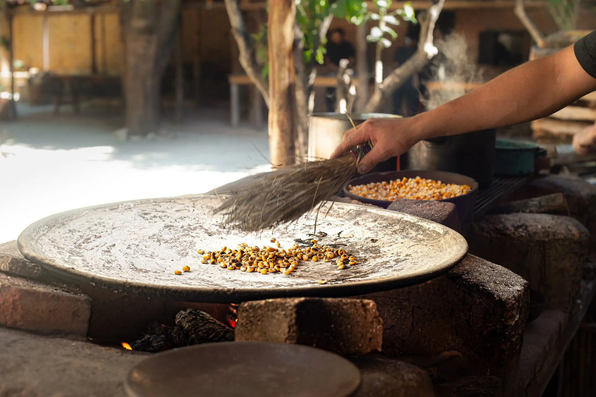 Nixtamalised maize being toasted on a comal to prepare tejate, often affectionately called the Drink of the Gods, a pre-Hispanic non-alcoholic beverage. After toasting, the kernels are ground on a volcanic stone metate and combined with fermented cacao beans, toasted mamey pits, and dried flowers from the rosita de cacao tree.