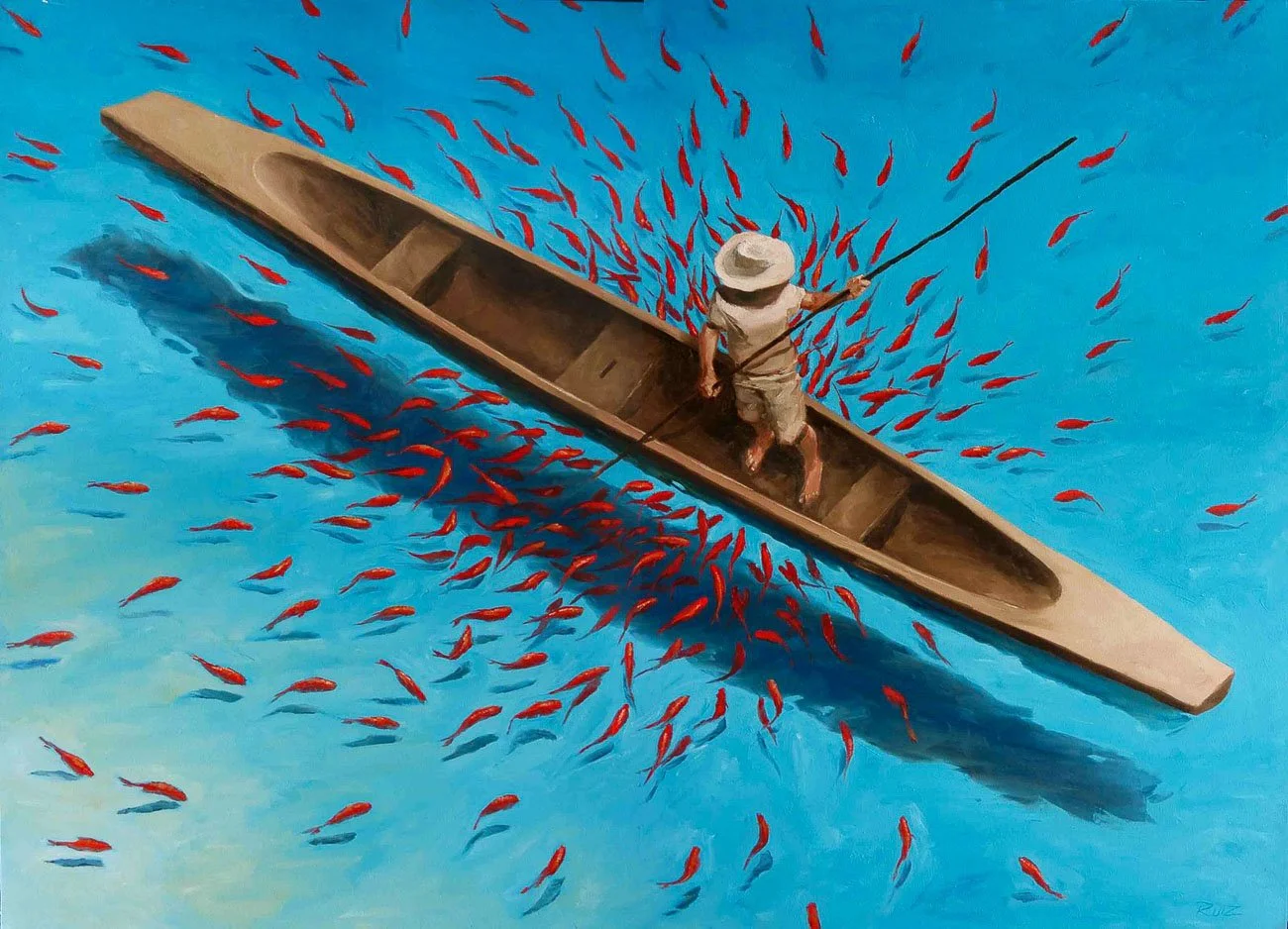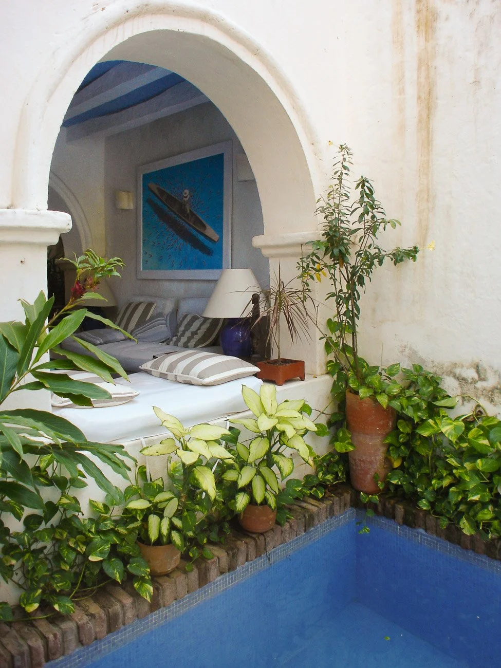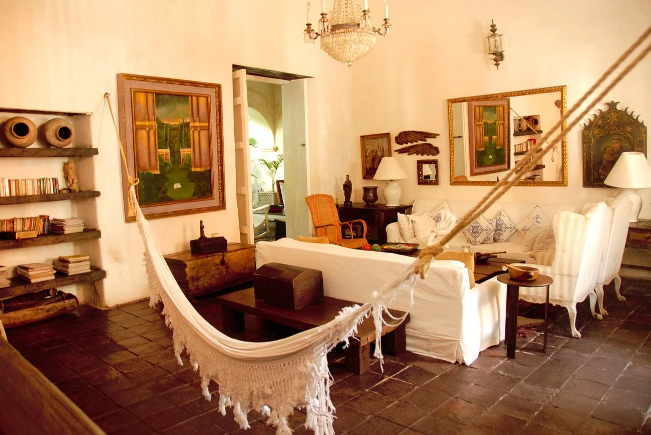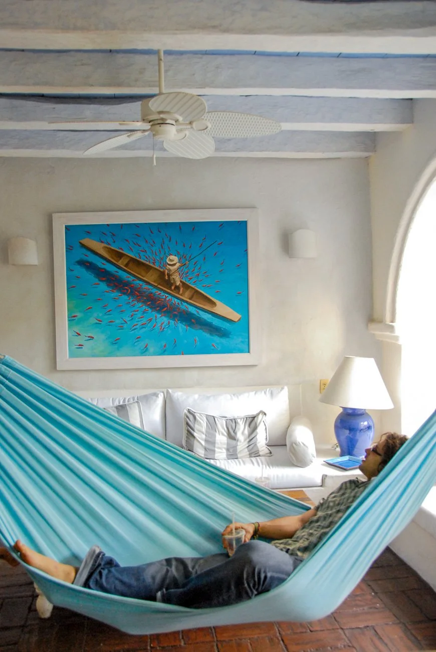 The house comprises four guest rooms, a small pool, and a rooftop deck. Art anchors the space. Paintings and works by the quietly powerful Colombian artist Pedro Ruiz line the walls, adding emotional depth and a strong sense of place to the house. His imagery — boats, rivers, landscapes carrying history — feels quietly resonant here. Paired with the soft interiors and filtered light, Casa Blanca becomes a refuge from Cartagena’s heat and intensity.