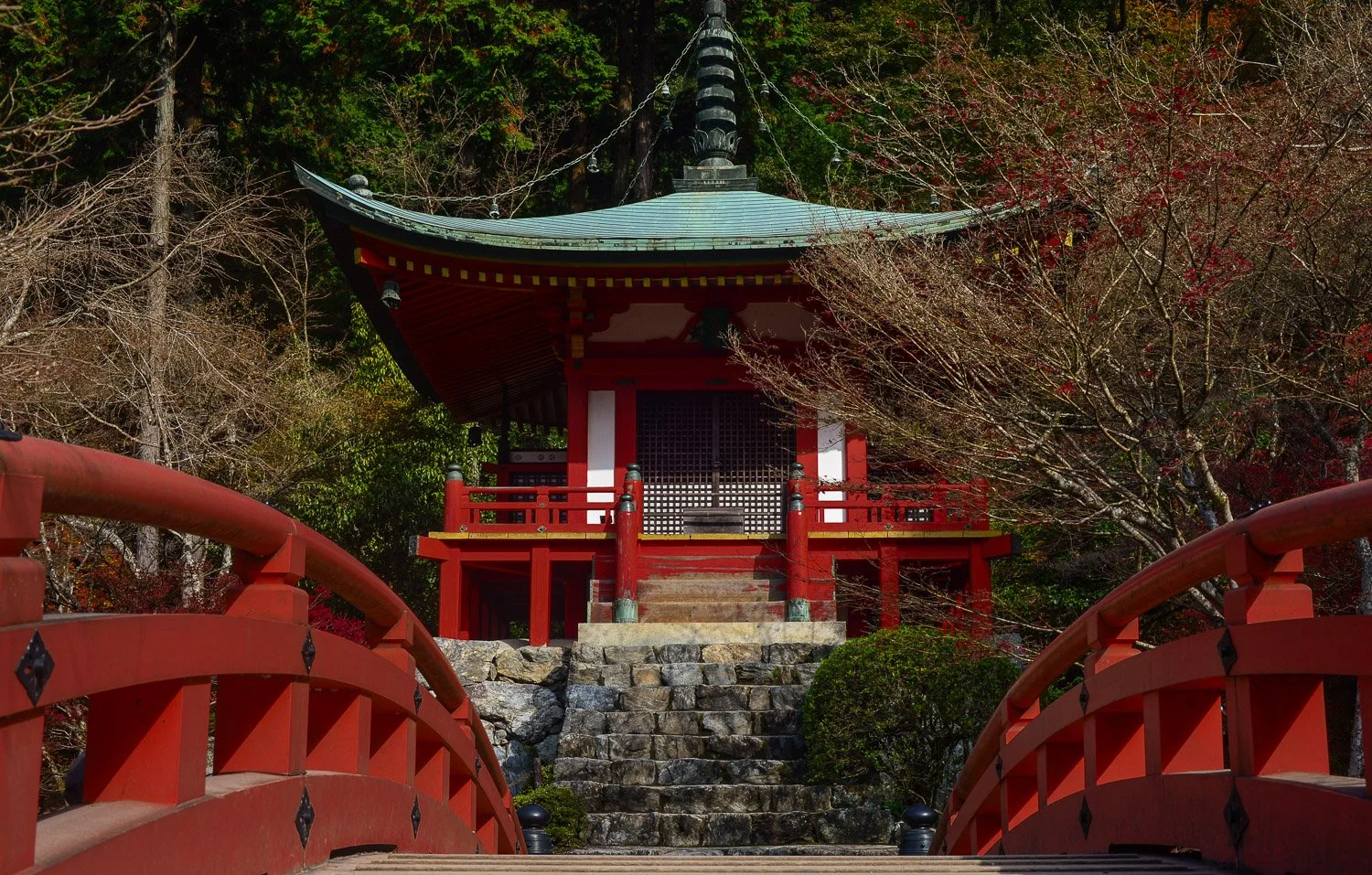 is one of the most iconic and scenic parts of the temple complex, situated on an island in a pond at the foot of the hill, near the entrance to the Lower Daigo grounds (Shimo Daigo). Bentendō Hall is dedicated to Benzaiten (Sarasvati), the goddess of knowledge and liberal arts. She is recognised as one of the Seven Deities of Good Fortune (Shichifukujin).