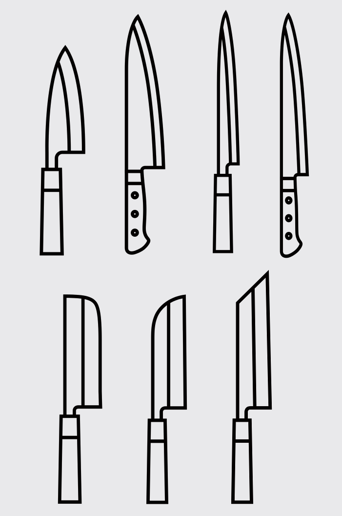 Kiritsuke – a long, straight blade similar to the Yanagiba and Usuba, often used for slicing sashimi and cutting vegetables.