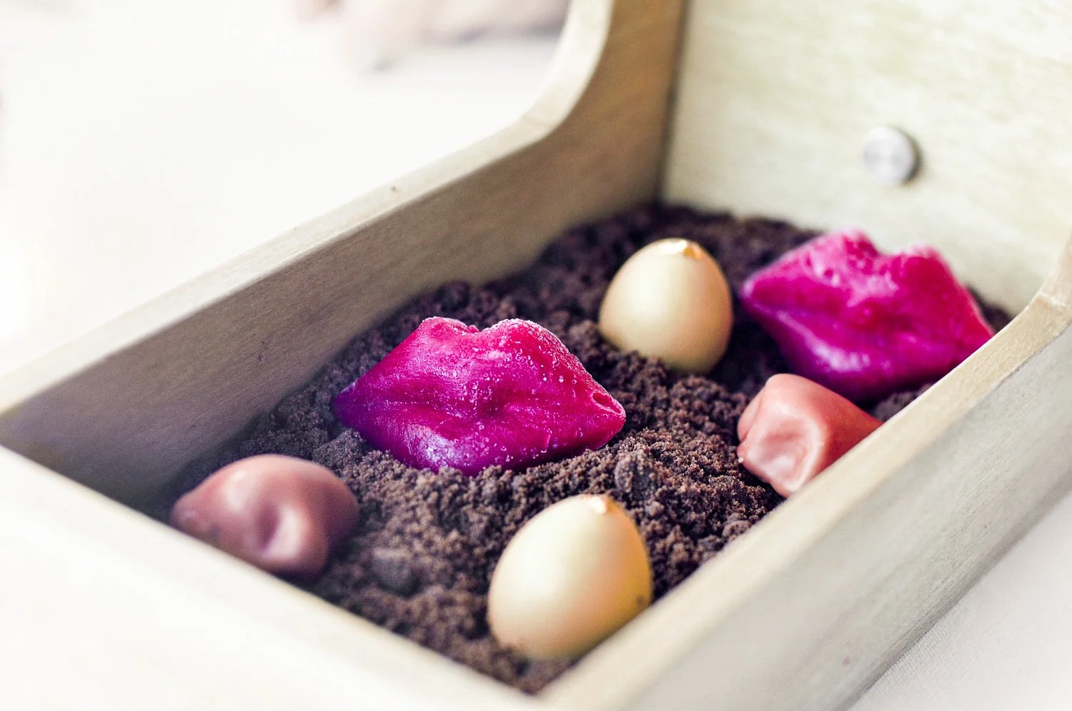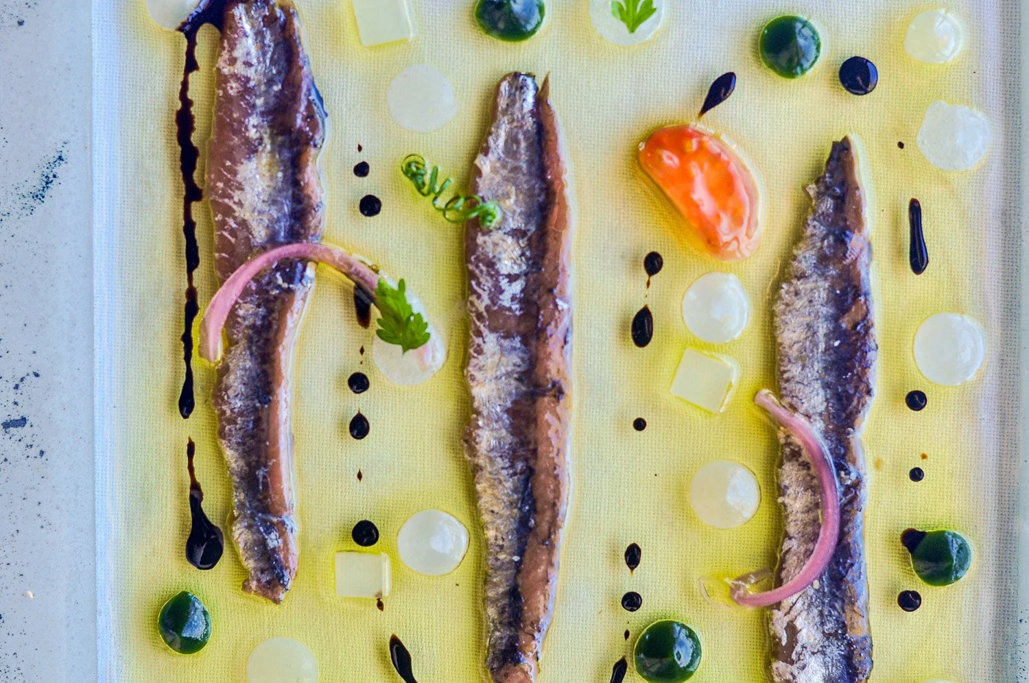 The dining room is elegant and tranquil, opening towards the sea. White tones mirror the horizon beyond the windows, while the plates add contrast and spark imagination. The presentation draws evident influence from Catalan Surrealism, echoing the visual language of Joan Miró and Luis Buñuel, with a lyrical undertone that recalls the poetry of Federico García Lorca. It’s expressive, but never theatrical.