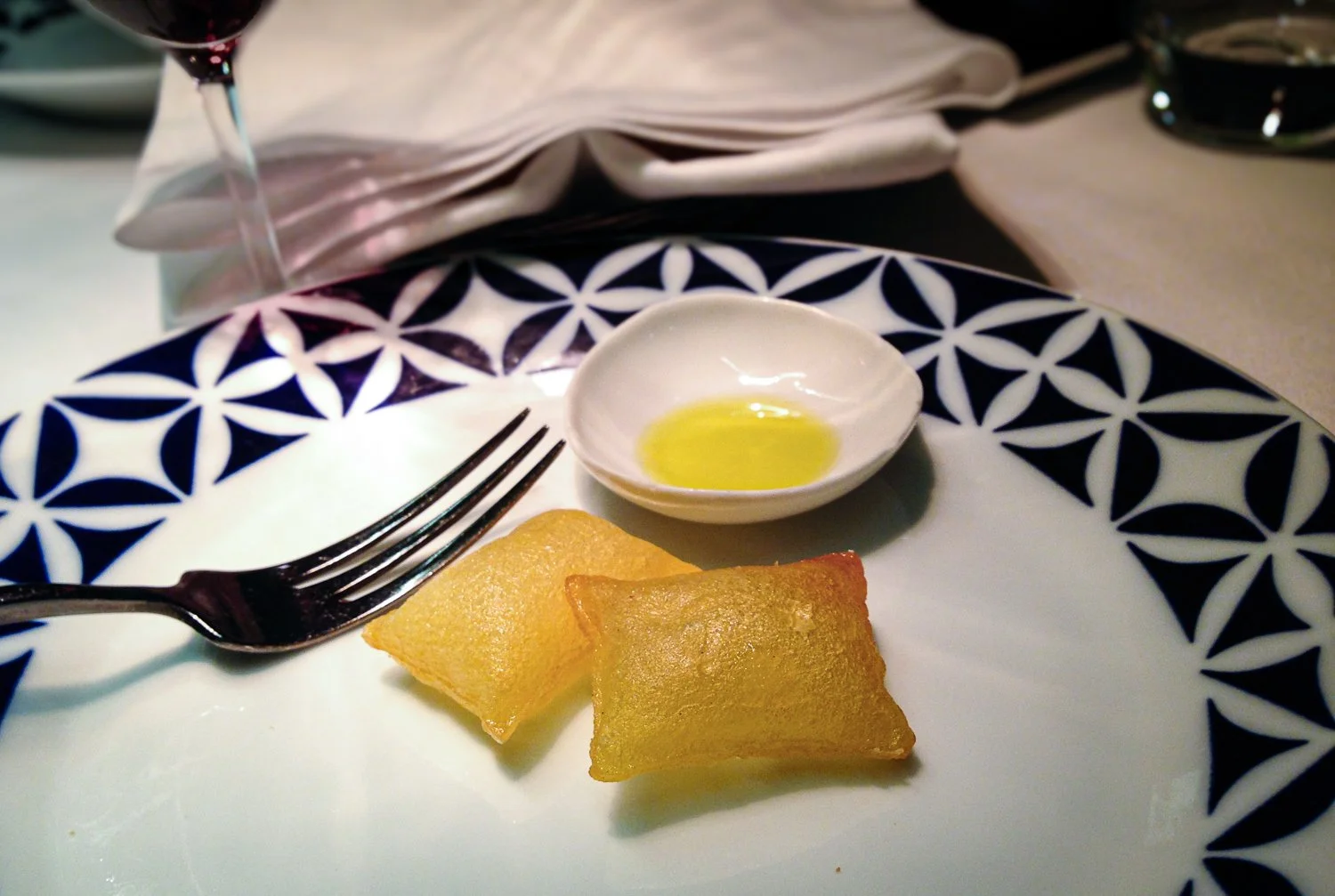The meal started with an amuse-bouche of calamari salad and Pommes soufflées, which are inflated potato pillows. These appear deceptively simple but demonstrate strong technique. The process involves layering two thin slices of potato—one dusted with starch and the other lightly brushed with egg white so they adhere. The potatoes are then deep-fried initially at one temperature to cook, and subsequently at a different temperature where they self-inflate. This requires precision, timing, and careful inquiry to create the effect of hollow, crispy pillows with air inside.