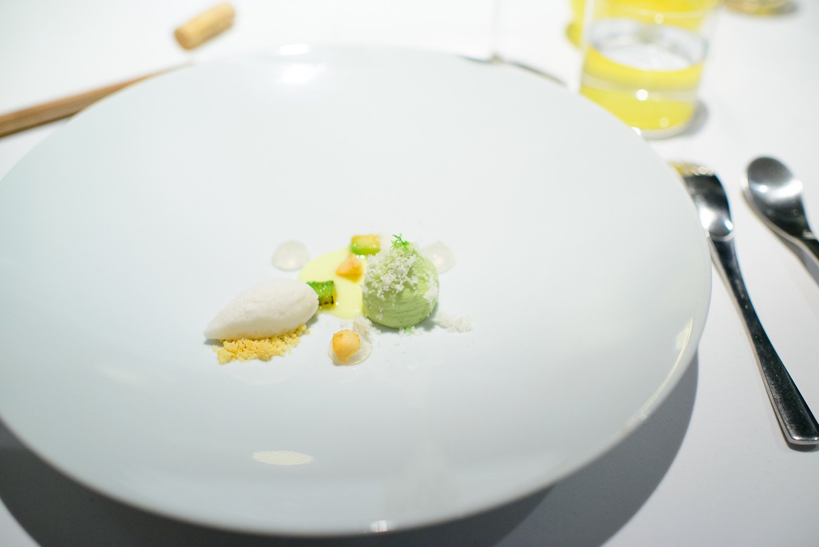 At the very end came Chipilín sorbet, made from Chipilín, an herb similar to verdolaga that grows in southern Mexico, particularly in Chiapas and Oaxaca. It was flambéed tableside with mezcal. Part theatre, part farewell.