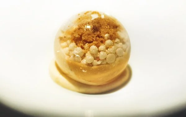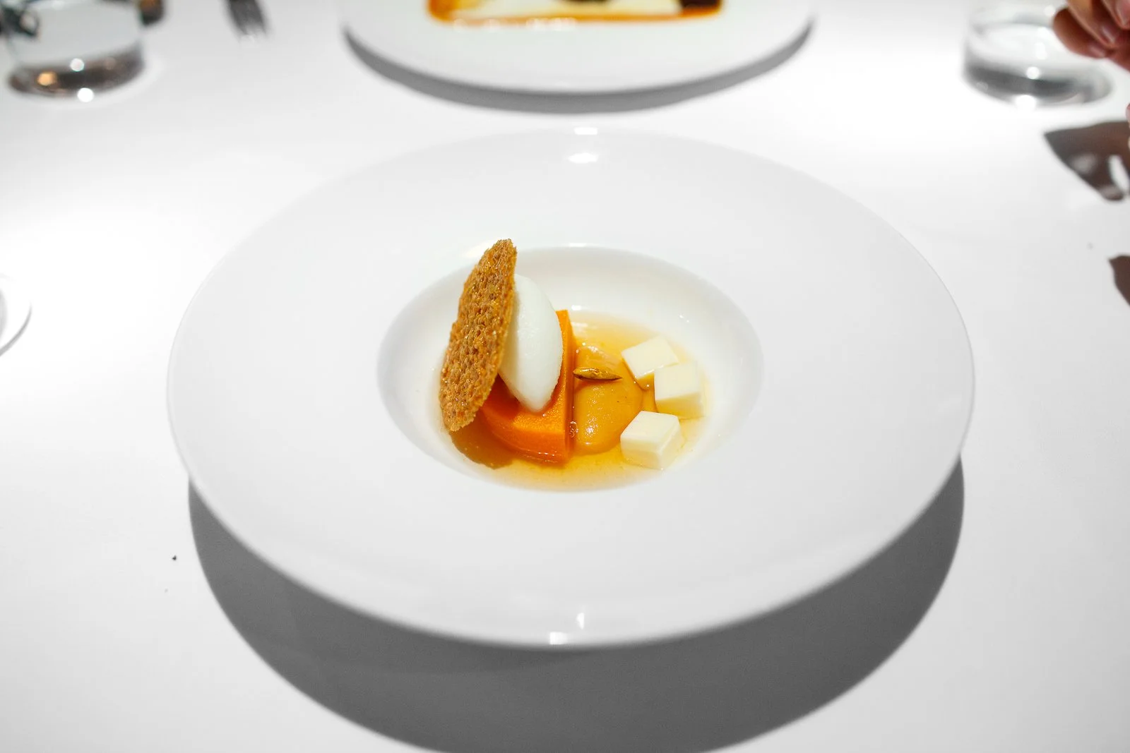 A blown sugar sphere demonstrated the pastry kitchen’s technical precision. Blowing sugar that thin requires years of patience and discipline. Here, it seemed effortless. The sphere was filled with piloncillo (unrefined sugar commonly used in Mexican cooking), ice cream, and guava purée, and topped with micho lime meringues, peanut Powder, amaranth crumble, and mandarin gel. Each bite gently transitioned between crisp, soft, delicate, and rich.