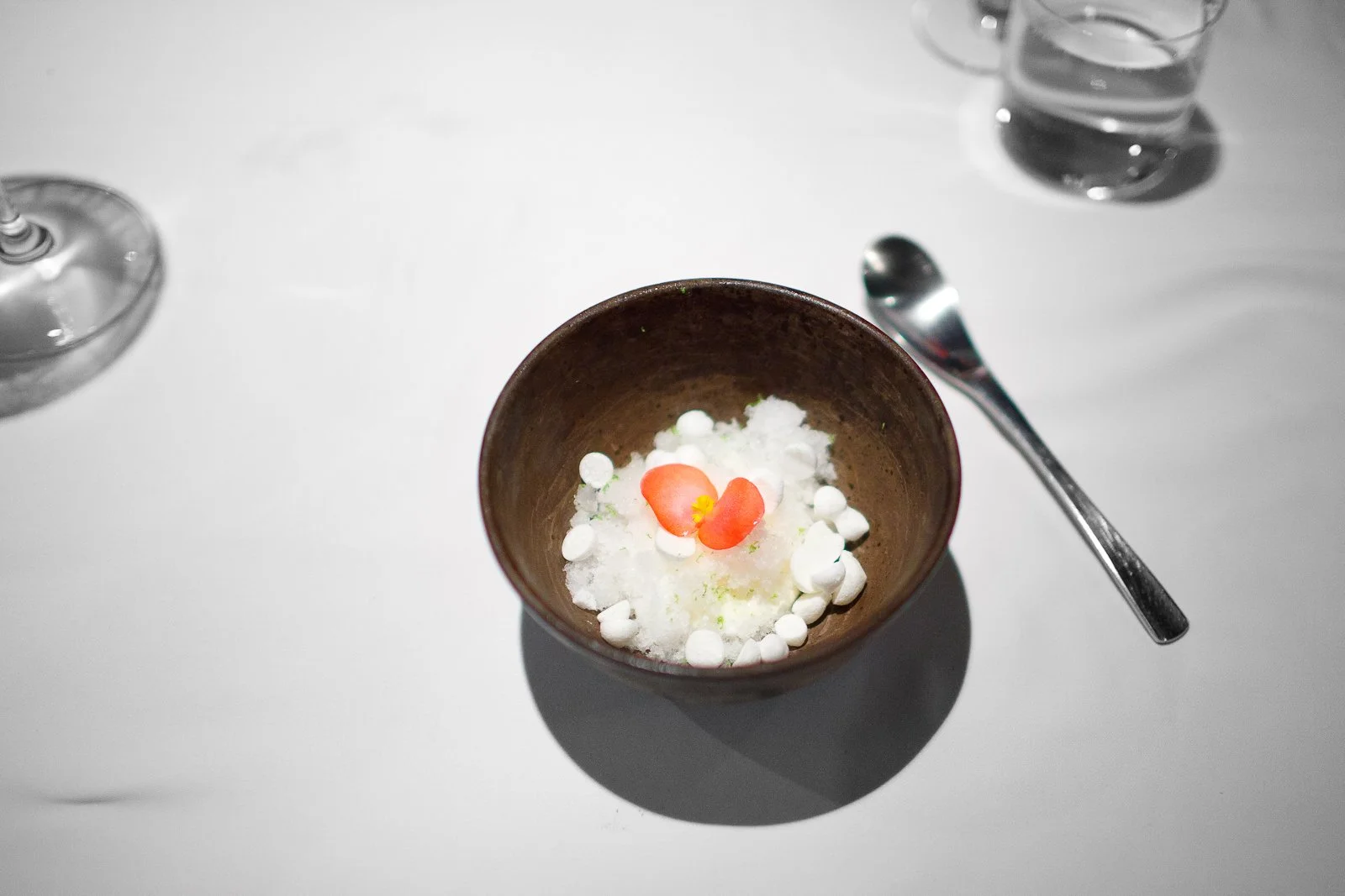 A lime margarita granita, feather-light and refreshing, with Cointreau cream, tiny lime meringues, lemon zest, and dragon begonia petals. It tasted like snow in summer.