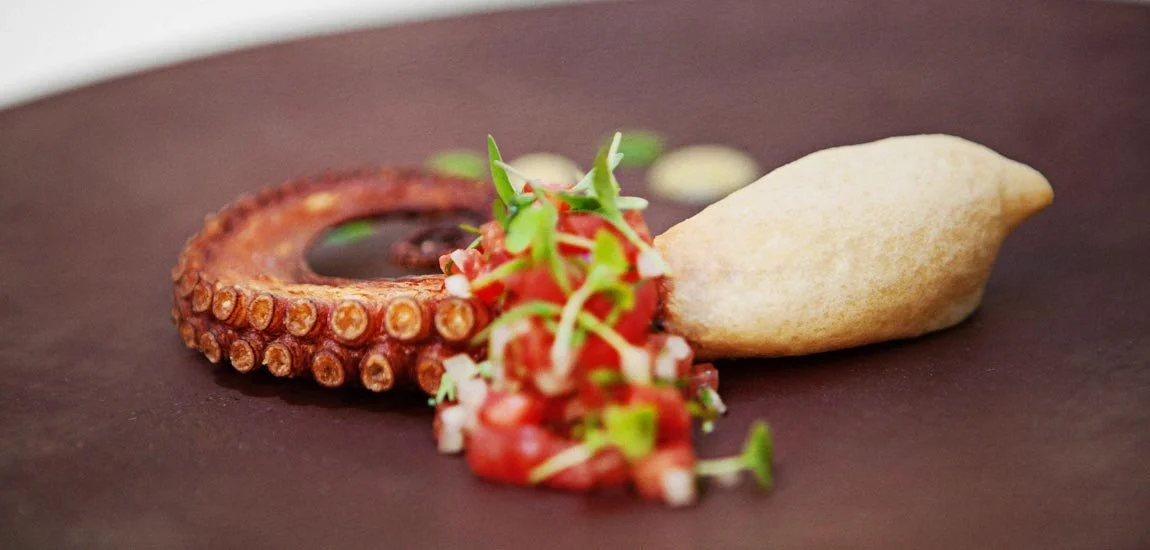 Pulpo a la Mexicana — single octopus tentacle, crisp at one end and dressed in fresh pico de gallo at the other. Finished with olive sauce and a delicate basil reduction. The presentation was striking, but the clarity of flavour was more impressive still.