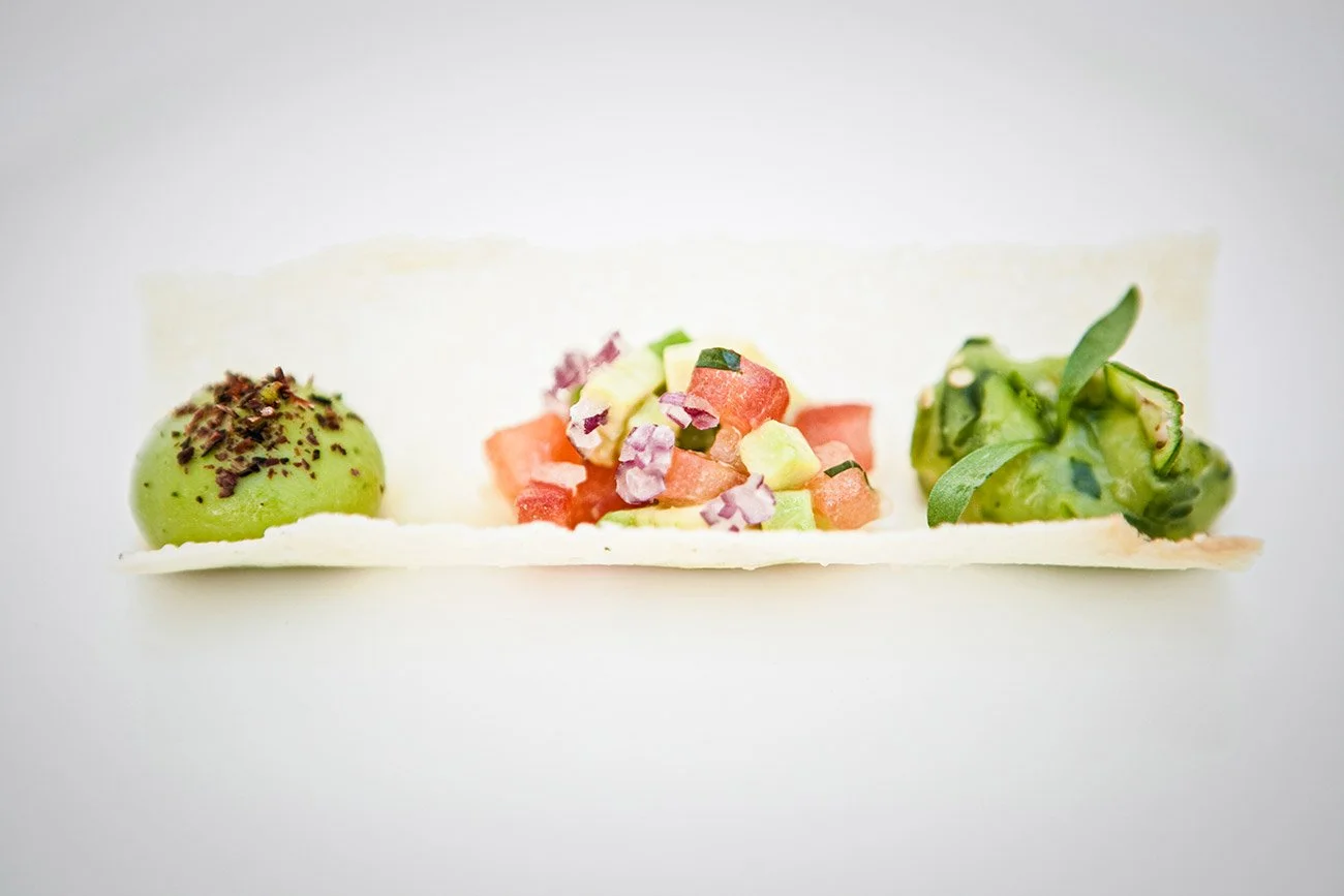 Chicharrón de queso, a crispy cheese tuile served with three different avocado purées: one earthy with chapulines, one fresh with pico de gallo (a mix of minced red onion, tomato, chilli, and lime), and one lifted with tomatillo, coriander, and a hint of green chilli.