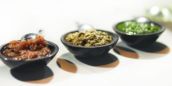 From left to right a smoky Salsa Roja built on roasted garlic, onion, manzano, and habanero chiles; a Salsa Yucateca blending pumpkin seeds, chamomile, lime, and cilantro, nutty and gently sharp; and a vivid Salsa Verde of habanero, tomatillo, and whole-root cilantro, bright, fiery, and alive.