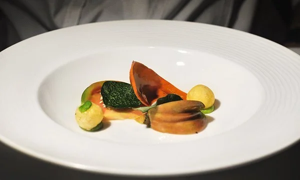 Heirloom tomato salad, topped with breaded Oaxaca cheese spheres, avocado purée, fried tomato skin, bean leaves, and a sesame and chilli vinaigrette. In this dish, the fried tomato skin was a revelation in colour, texture, and flavour.