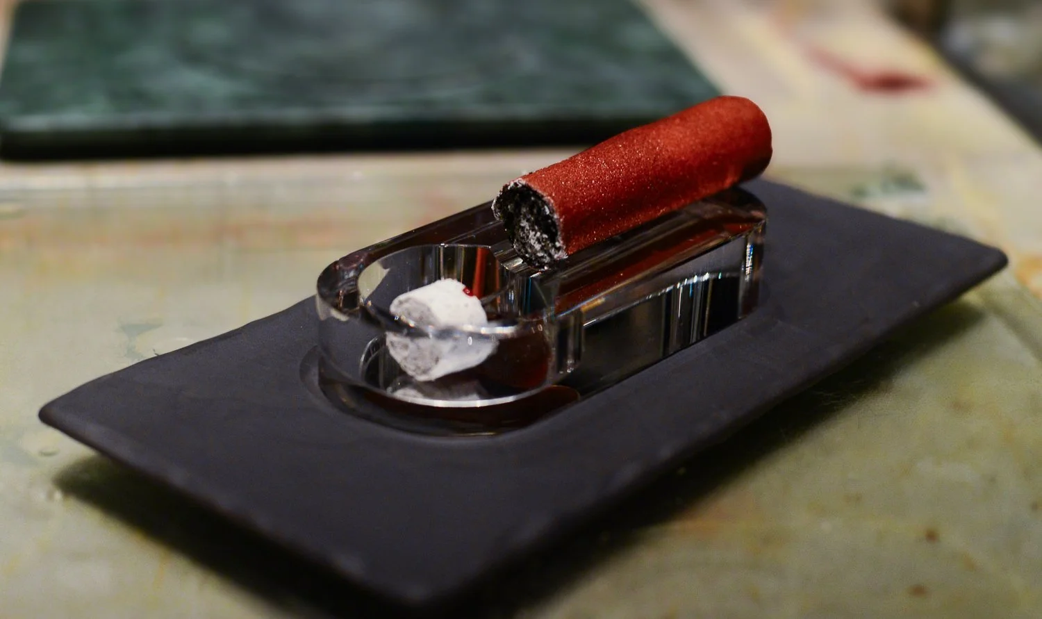 Cigar Leaf Smoked cherry root and crispy potato crust; lined with an green apple gel sheet and filled with cucumber black sesame ash