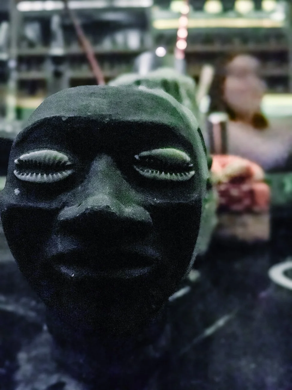 As you open the door, you step into a glowing display wall filled with glass urns containing Mexican botanicals, roots and small ritual objects curated around the bar’s shamanic inspiration.